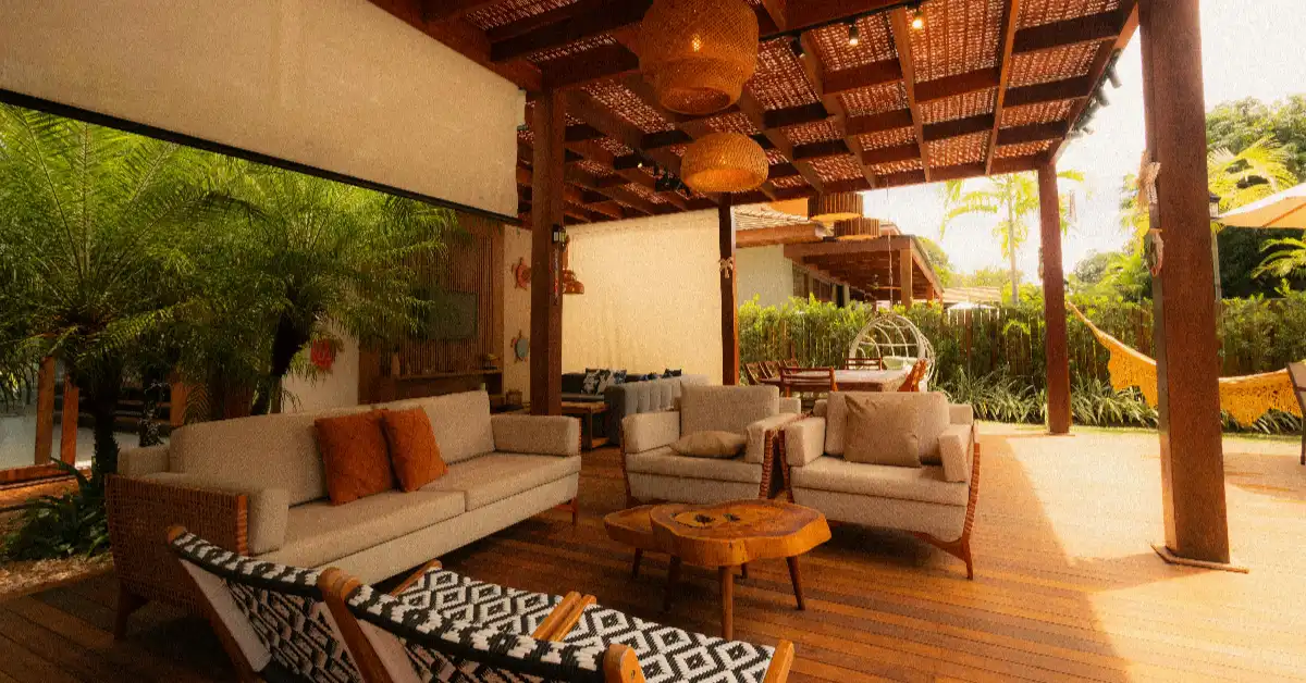 This first setup is honestly everything I’ve ever wanted in a backyard. The way they layered the textures with those cozy cushions just makes you want to sink right in and stay there forever. Having reliable outdoor ceiling lights installed under a covered patio like this is a total game changer for evening hangouts. You get that perfectly even, soft glow that makes everyone look amazing in photos without being too bright and blinding. It just feels like an extension of your living room. The only annoying part is remembering to bring all those white pillows inside when it rains, but it’s totally worth the effort for this level of comfort.